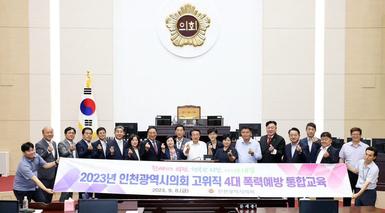 [인천 세계타임즈=심하린 기자] 인천광역시의회(의장 허식) 의원들이 4대 폭력 예방의 중요성 공감과 성인지 감수성 강화에 솔선수범하고 있다.
