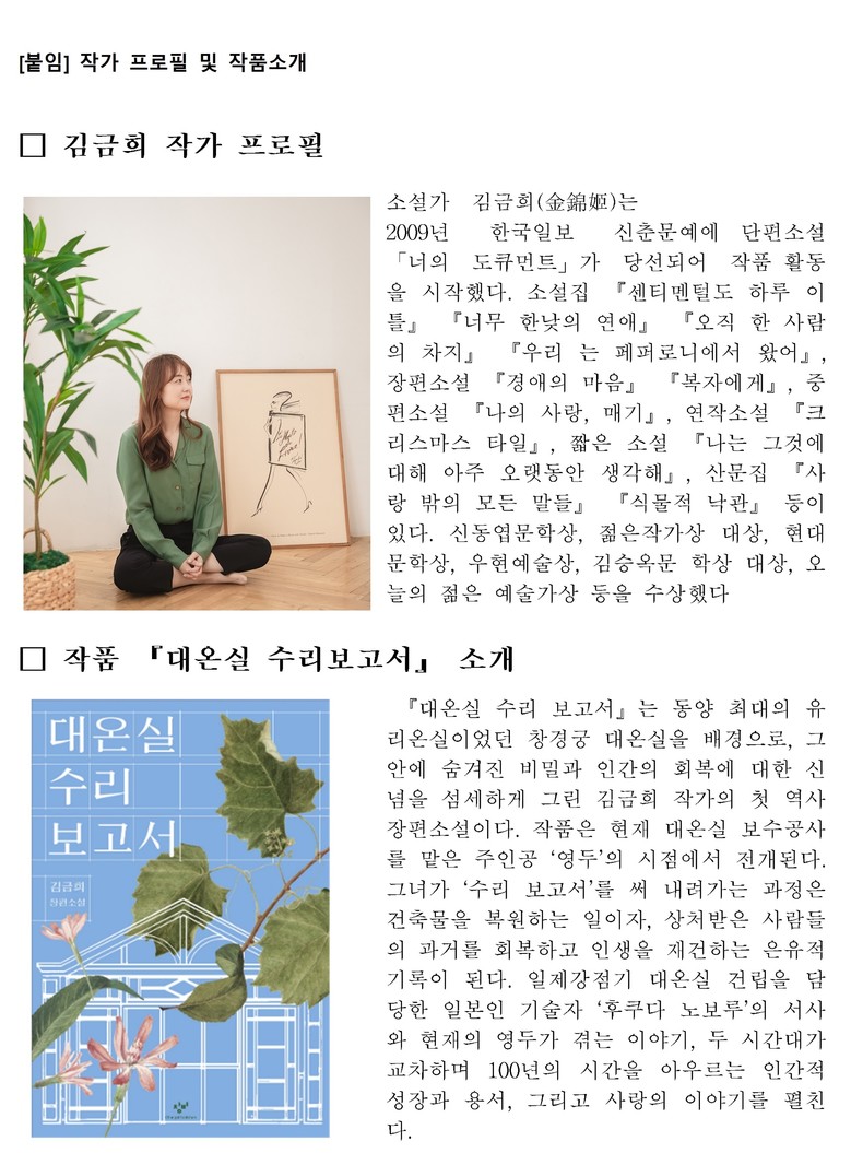 정독도서관과 창경궁 대온실은 오랜 시간 서울의 역사와 시민의 일상 속에 자리한 상징적인 공간이다. 김금희 작가는 이번 강연에서 자신의 작품 『대온실 수리보고서』에 담긴 이야기를 중심으로, 공간이 지닌 기억과 그 안에서 살아가는 사람들의 관계를 섬세하게 풀어낼 예정이다.