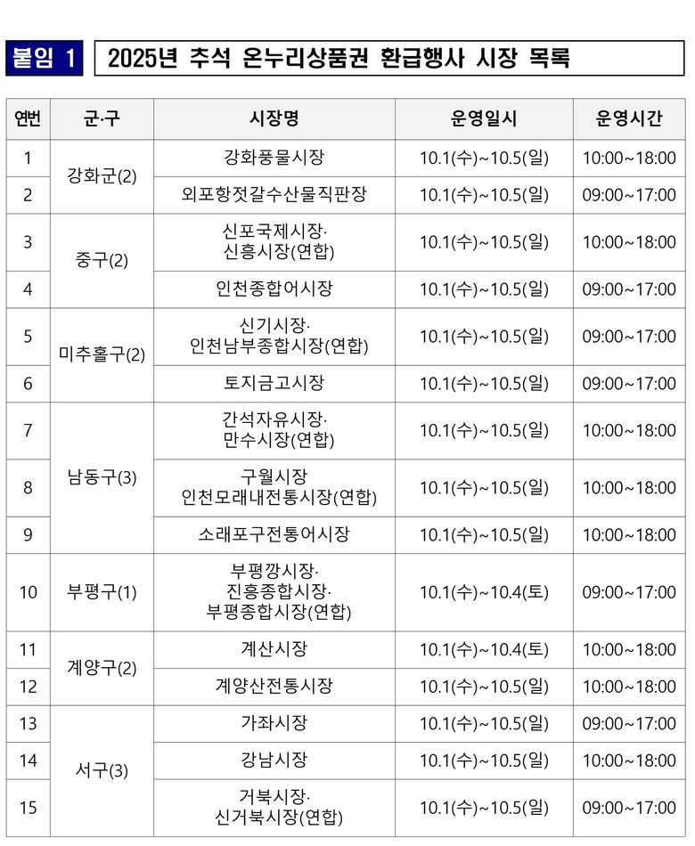 - 10월 1일부터 5일까지 15개 전통시장 참여, 수산물 소비 활성화·물가 안정 기여 - [인천 세계타임즈=심하린 기자] 인천광역시(시장 유정복)는 민족 최대 명절인 추석을 맞아 전통시장과 수산물 소비를 활성화하고 시민들의 장바구니 물가 부담을 덜기 위해 10월 1일부터 5일까지 5일간 관내 15개 전통시장에서 ‘온누리상품권 환급행사’를 진행한다고 밝혔다.