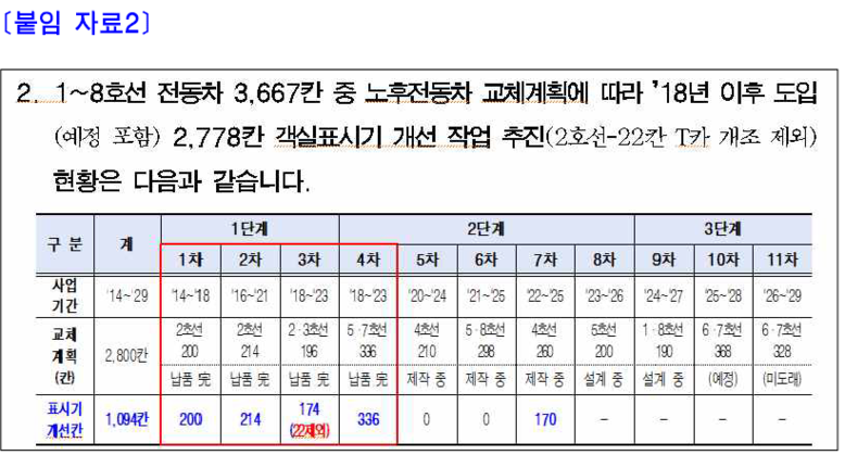 더욱이 개선을 완료한 차량에서도 문제가 발생했다. 공사 측은 “지난 6월 개선을 마친 2호선 200칸에서 간헐적으로 고정 표출 현상이 나타나 업체가 대책을 마련 중”이라고 설명했다. [※붙임 자료3]