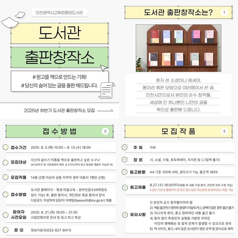 2025년 하반기 모집은 출판 경험이 없는 인천 시민 누구나 참여할 수 있으며, 시·소설·수필·포토에세이·자서전 등 다양한 장르의 작품을 접수한다.