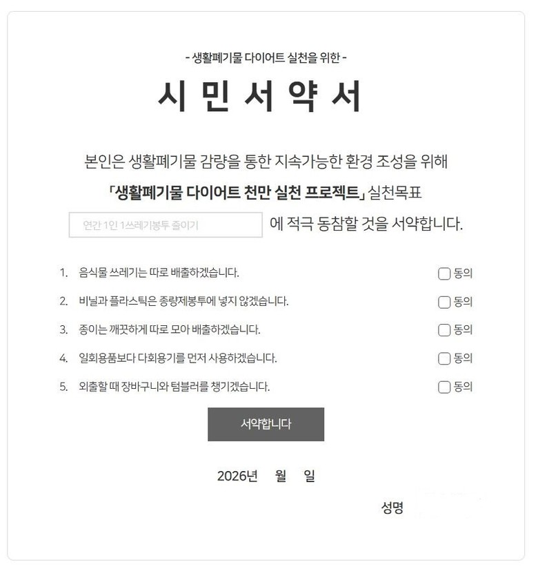 시민 실천서약은 총 5개 항목으로 ① 음식물 쓰레기 분리배출 ② 비닐과 플라스틱 분리배출 ③ 종이 분리배출 ④ 다회용기 사용 ⑤ 외출시 장바구니와 텀블러 사용이다.