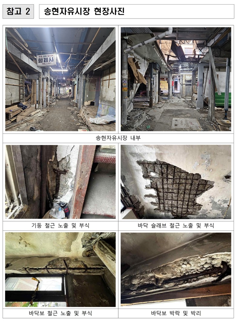 송현자유시장은 노후화가 심각해 안전 확보가 시급한 곳으로, 올해 8월 실시한 정밀안전점검에서 7개 동 E등급, 3개 동 D등급 판정을 받았다. E등급은 주요 구조부재에 심각한 결함이 있어 즉각 사용이 금지되는 수준이며, D등급 역시 구조적 안정성이 떨어지는 위험시설로 분류된다. 이에 인천시는 「재난 및 안전관리 기본법」 제31조에 따라 긴급 철거를 결정했다.