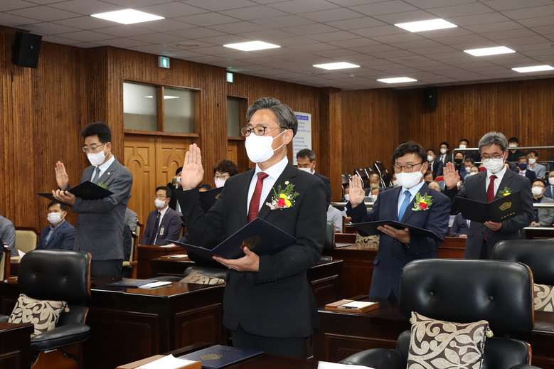 시의원들은 의원선서를 통해 법령을 준수하고 주민의 권익신장과 복리 증진 및 지역사회의 발전을 위하여 의원의 직무를 양심에 따라 성실히 수행할 것을 약속하고 선서문에 서명했다.
