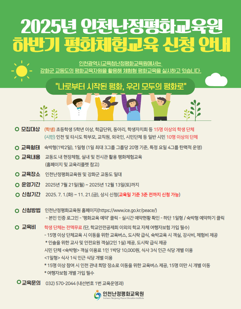 프로그램 안내 및 신청은 인천난정평화교육원 누리집(https://www.ice.go.kr/peace/)에서 확인할 수 있으며, 자세한 문의는 032-570-2044(내선 1번)로 하면 된다.