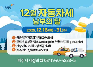 파주시 관계자는 “체납 발생 시 가산세 부과 및 번호판 영치 등의 불편이 있을 수 있으니, 기한 내 납부를 꼭 부탁드린다”라며, “앞으로도 납세 편의를 위해 다양한 서비스를 지속적으로 제공하도록 하겠다”라고 말했다.