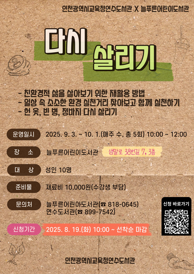신청은 8월 19일(화) 오전 10시부터 연수도서관 누리집(평생학습 → 온라인접수)에서 선착순으로 가능하다.