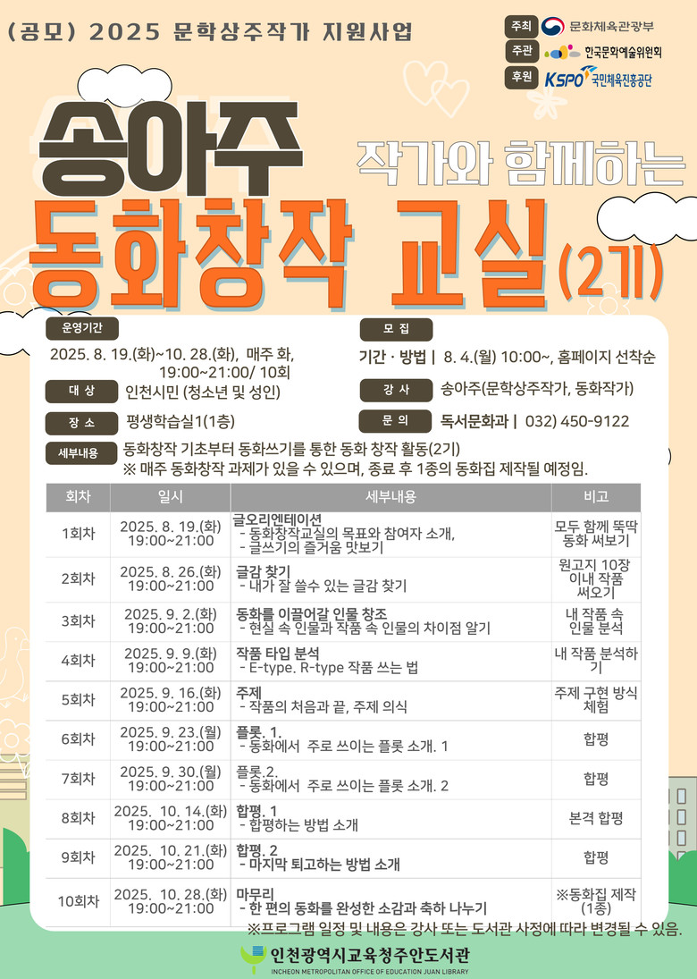 총 10차시로 구성된 이번 강의는 동화 글감 찾기부터 창작, 합평, 퇴고에 이르기까지 이론과 실습을 병행하며 진행된다. 참여자들의 창작 작품은 수업 종료 후 동화집으로 엮어 출간할 예정이다.