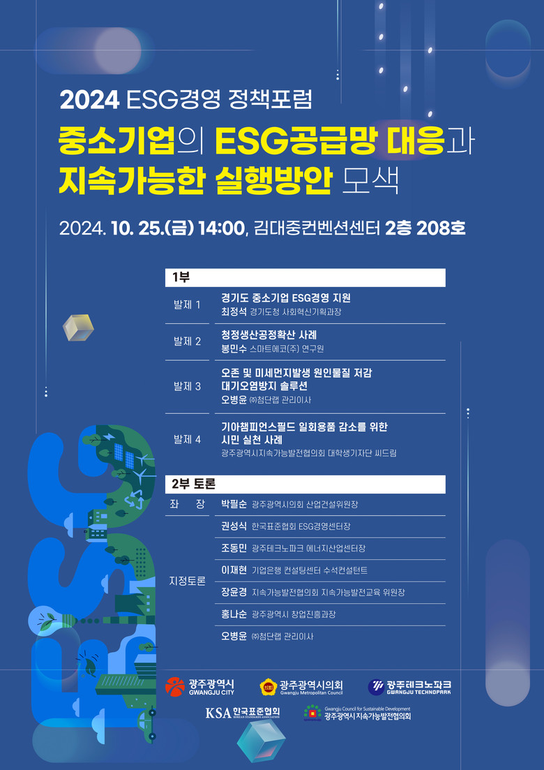 주제 발표는 ▲최정석 경기도 사회혁신기획과장의 ‘경기도 중소기업 이에스지(ESG) 지원’ ▲봉민수 스마트에코㈜ 연구원의 ‘광주시 청정공정 확산사업 수행 사례’ ▲오병윤 ㈜첨단랩 이사의 ‘오존 및 미세먼지발생 원인물질 저감 대기오염방지 솔루션’ ▲대학생기자단 씨드림의 ‘기아챔피언스필드 일회용품 감소를 위한 시민 실천 사례’ 등으로 진행된다.