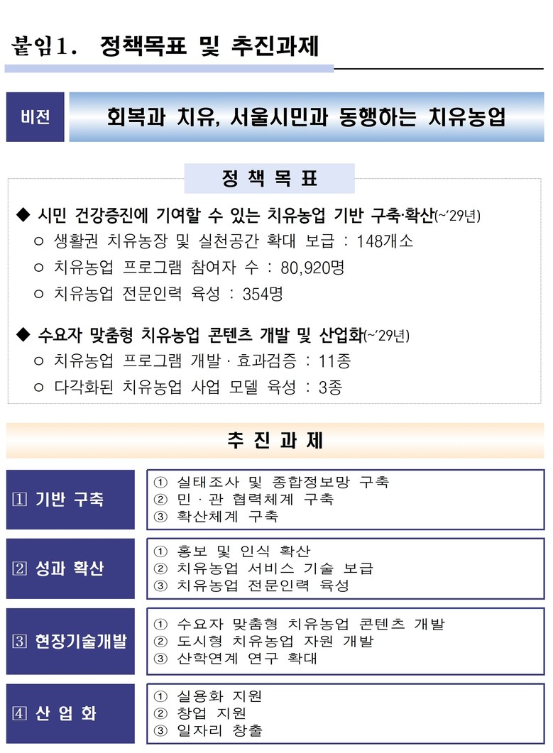 이번 계획은 빠르게 변화하는 도시 환경 속에서 치유가 일상적으로 필요한 상황에 대응해, 누구나 생활권에서 쉽게 이용할 수 있는 ‘서울형 치유농업’을 구축하고 공공서비스로 정착시키는 것이 목표다.