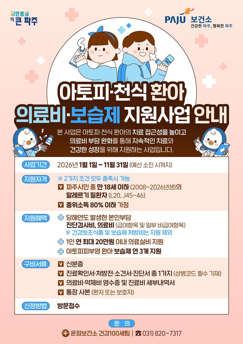 정영숙 운정보건소장은 “아토피피부염과 천식은 꾸준한 관리가 중요한 질환인 만큼, 대상자 특성을 고려한 맞춤형 지원을 통해 환아와 보호자의 부담을 덜어드리고자 한다”라며 “앞으로도 시민이 체감할 수 있는 알레르기질환 예방·관리 사업을 지속적으로 추진하겠다”라고 밝혔다.