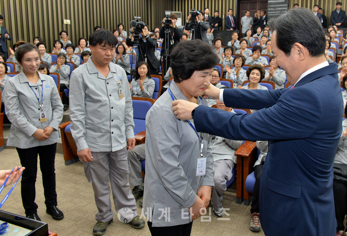 정세균 국회의장이 2일 오전 서울 여의도 국회 제4회의장에서 열린 청소근로자 직접고용 기념 신년행사에 참석해 환경미화 직원에게 신분증을 걸어주고 있다. 2017.01.02.