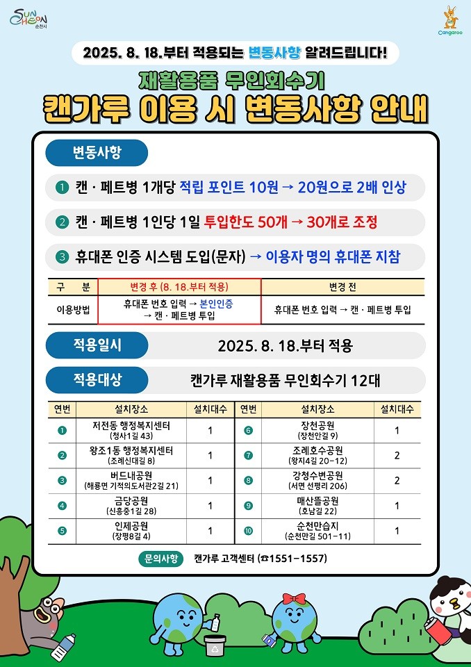 주요 개선 사항은 ▲보상 포인트 2배 인상 ▲1인 1일 투입 한도 조정 ▲휴대폰 인증 시스템 도입으로, ‘캔가루’ 재활용품 무인회수기에 적용된다.