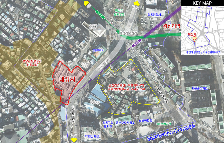 대상지는 6개 노선이 교차하는 광역 접근성이 매우 우수한 고차 역세권으로 서울 동북권의 핵심 요충지인 왕십리 광역거점에 위치하고 있다. 주변에는 성동구청과 구의회, 성동경찰서 등 주요 공공기관이 밀집해 있어 공공업무 및 상업·문화 기능이 집중된 지역이다. 현재는 주차장 부지로 이용되고 있다.