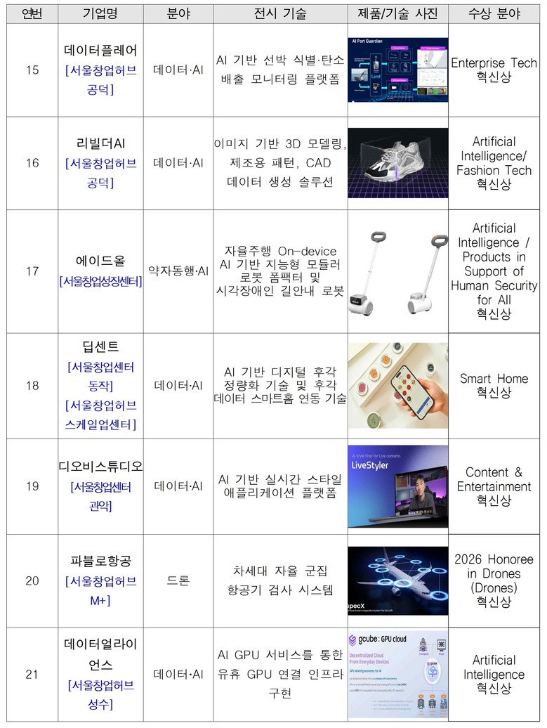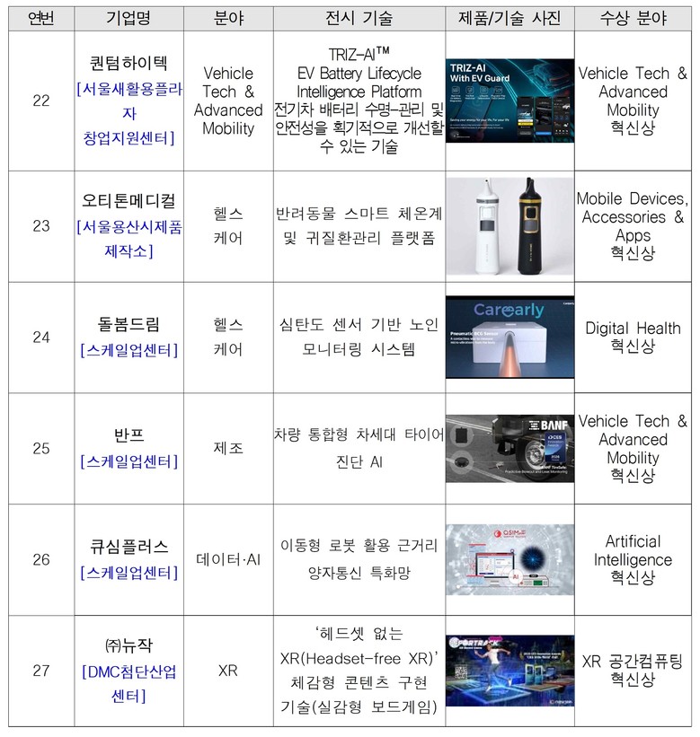 이처럼 서울창업허브는 해양·로봇·모빌리티 등 기술기업이 스케일업할 수 있도록 분야별 특화 지원을 제공하며, CES에서 연속적인 성과를 내는 기반이 되고 있다.