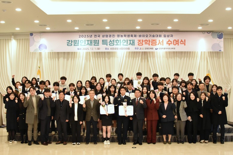 [강원도 세계타임즈=김민석 기자] 강원인재원(원장 김학철)은 12월 1일(월) 11시, 춘천 세종호텔 사파이어홀에서 올해 치뤄진 전국 고교생 상업경진대회·영농학생축제·바이오기술경진대회에서 입상한 강원특별자치도 특성화인재 70명에 대한 장학증서 수여식을 개최했다고 밝혔다.