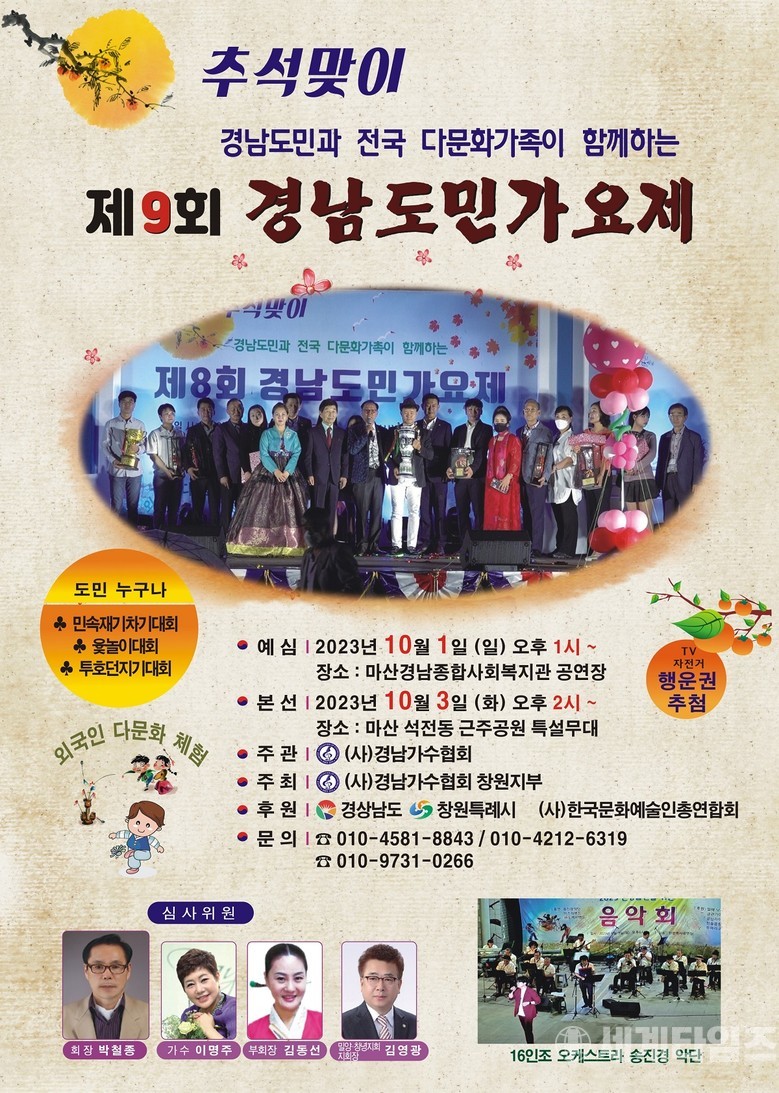 [세계타임즈 = 이판석 기자] (사)경남가수협회는 오는 10월 3일 오후 2시 창원시 석전동 근주공원 특설무대에서 경남도민과 전국 다문화가족이 함께하는 '제9회 경남도민가요제'를 개최한다"고 10일 밝혔다.