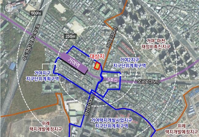 대상지는 5호선 거여역 2번 출구에 인접한 역세권 부지로, 양호한 입지 여건에도 불구하고 2022년 말 기존 건축물 철거 후 현재까지 나대지로 방치되고 있어 정비가 시급한 지역이었다.