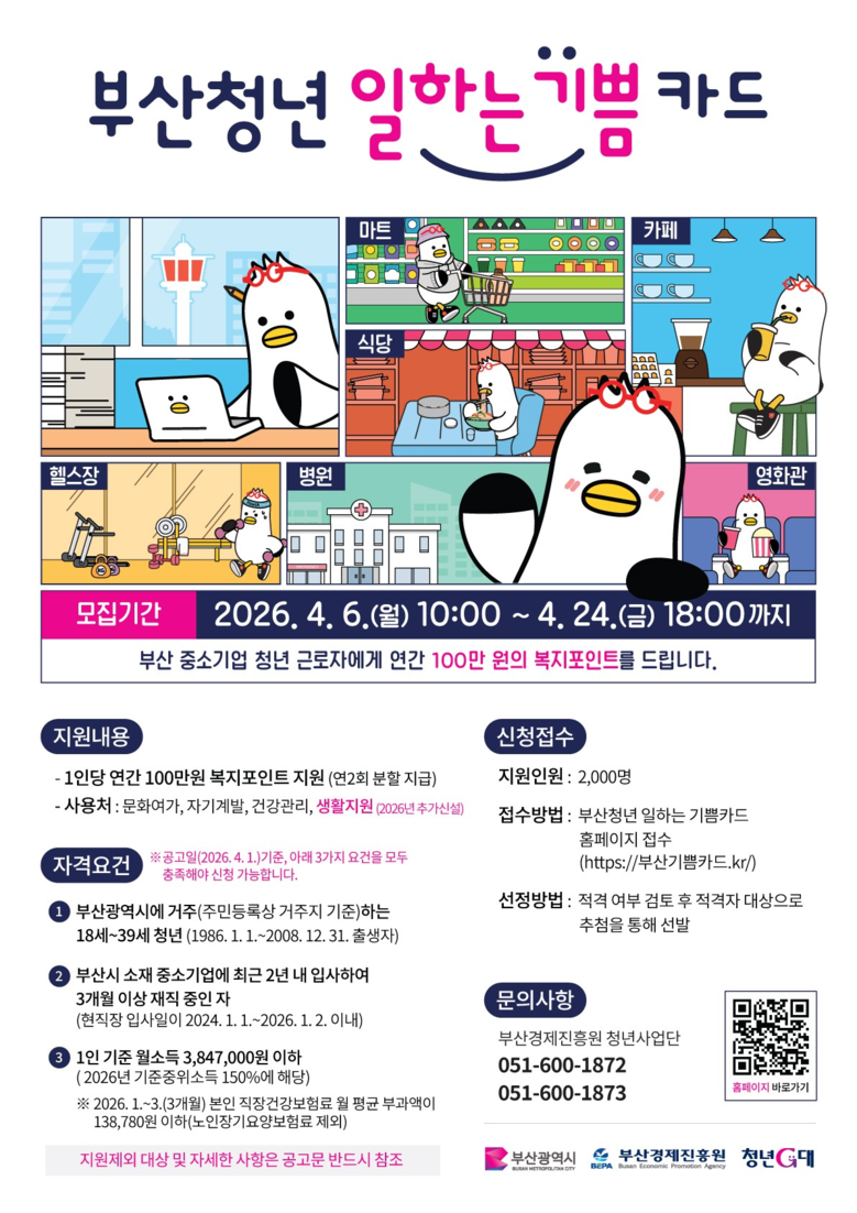 주민등록상 부산에 거주하며, 부산에 있는 중소기업에 3개월 이상 재직 중인 18~39세 청년에게 1인당 1백만 원의 복지포인트를 지원하며, 2천 명의 참여자를 모집한다.