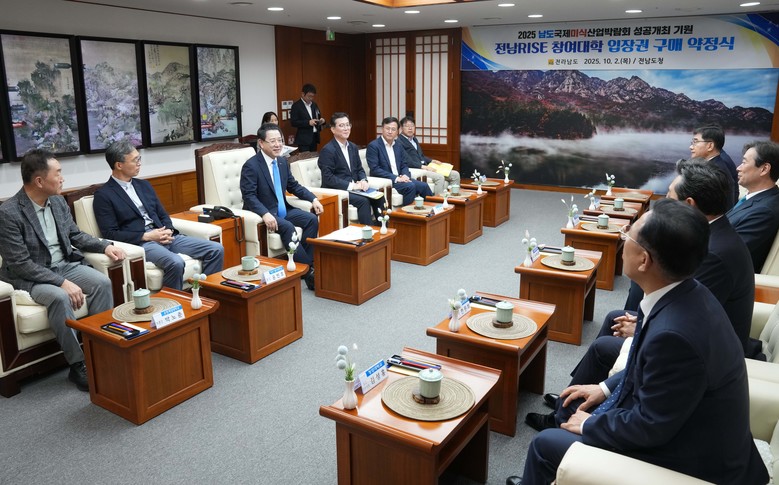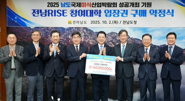 [전남 세계타임즈=우덕현 기자] 전라남도는 2일 도청 접견실에서 전남RISE 참여대학 총장단과 함께 ‘2025 남도국제미식산업박람회 입장권 구매 약정식’을 개최했다.