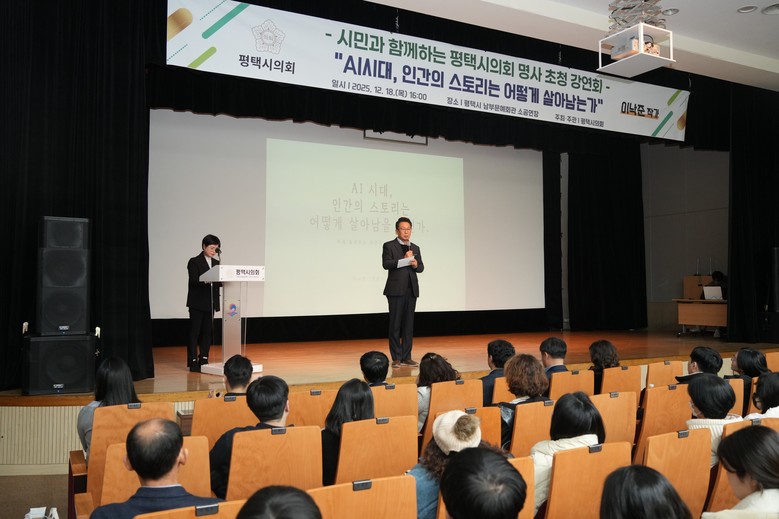 [평택시 세계타임즈=송민수 기자] 평택시의회는 12월 18일, 평택시 남부문화예술회관 소공연장에서 명사를 초청해 ‘AI시대, 인간의 스토리는 어떻게 살아남는가’를 주제로 강연회를 열었다.