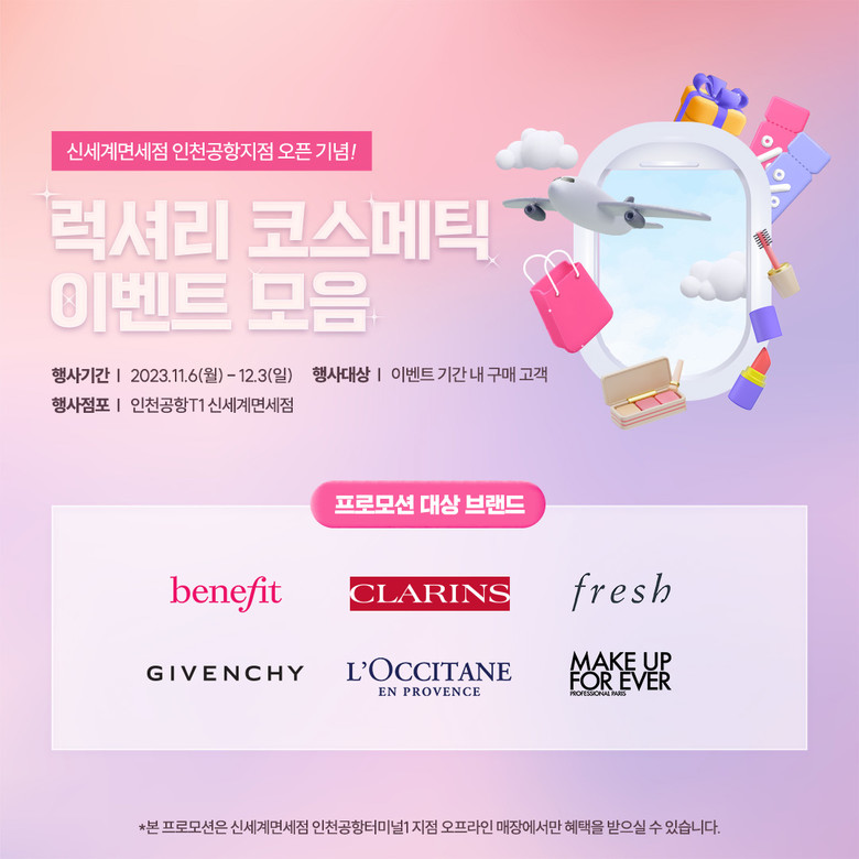 이번 행사는 인천공항 터미널1지점 정식 매장 오픈한 것을 기념해 진행하는 것으로 인기 해외 브랜드 △겔랑 △록시땅 △메이크업포에버 △베네피트 △퍼퓸 지방시 △프레쉬 △클라랑스 총 7개의 브랜드가 참여한다.
