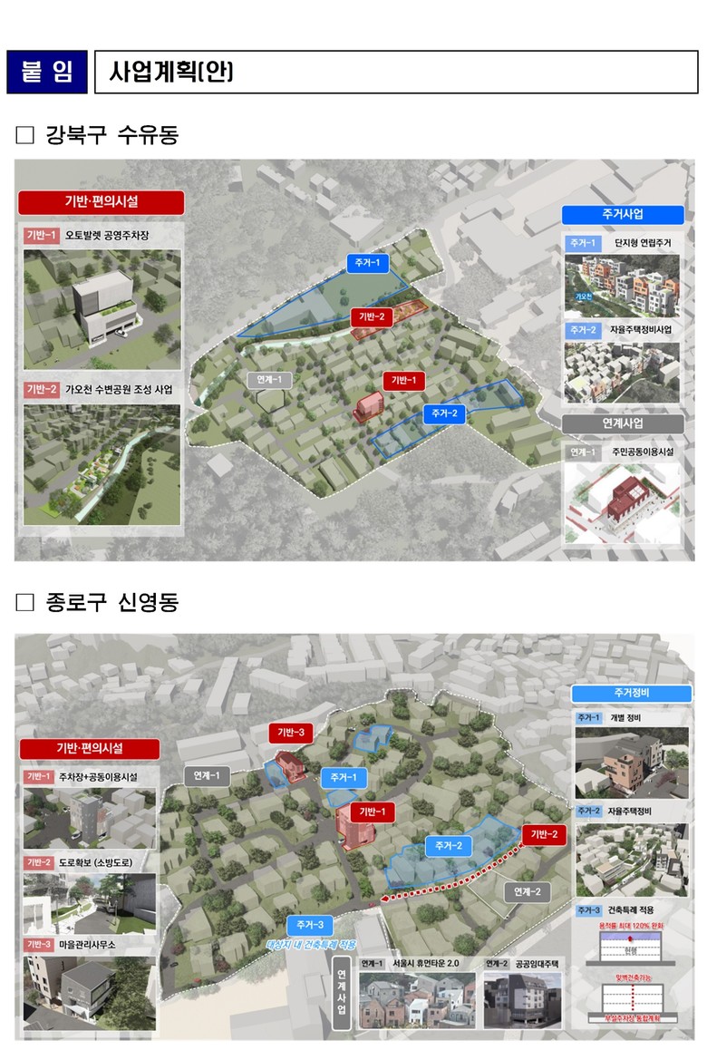종로구 신영동 너와나우리마을(신영동 214번지 일대, 44,071㎡)은 총 130억 원(국비·지방비)을 투입해 공영주차장 및 공동이용복합시설 조성, 순환동선을 위한 도로 확충, 마을관리사무소 설치 등을 단계적으로 추진할 계획이다. 이를 통해 저층주거지의 정주여건 개선과 생활서비스 강화를 도모할 예정이다.
