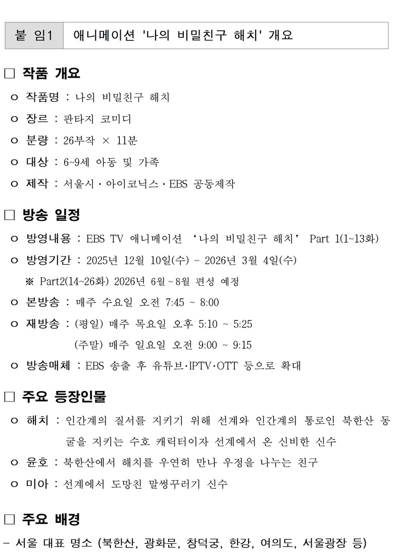 <나의 비밀친구 해치>는 선계와 인간계를 잇는 문을 지키는 신수 ‘해치’가 서울에 내려와 초등학생 소년 윤호를 만나면서 벌어지는 모험을 담은 26부작 판타지 코미디 애니메이션이다. 북한산, 광화문, 창덕궁, 한강 등 실제 서울 명소를 배경으로 일상 코미디와 마법 사건이 어우러져 아이들이 애니메이션 속 서울을 자연스럽게 경험하도록 기획했다.