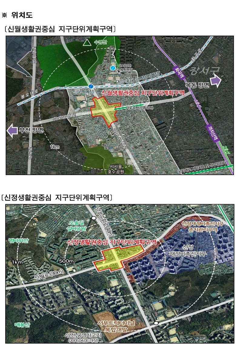 신월.신정생활권중심 지구단위계획구역은 모두 양천구 서측 끝단, 김포공항 인근에 위치한 준주거지역으로, 공항시설법에 따른 높이 제한 등 별도의 규제를 함께 받아온 지역이다. 신월생활권중심 지구단위계획구역은 남부순환로·가로공원로, 신정생활권중심 지구단위계획구역은 남부순환로·신월로 등 주요 간선도로를 끼고 있으며, 인근에 학교와 생활편의시설이 다수 분포해 주거생활권의 중심 역할을 해왔다. 그러나 주변 지역 개발이 활발히 진행되는 것과 달리, 다양한 규제로 인해 준주거지역으로서의 잠재력이 충분히 발휘되지 못했다.