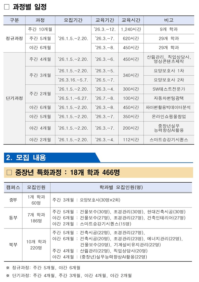 이번 상반기에는 총 77개 학과에서 2,004명을 모집하며, ▴중장년 특화과정 18개 학과 466명 ▴기업협력형 과정 6개 학과 165명 ▴전문기술과정 36개 학과 924명 ▴국가기술자격 과정 5개 학과 134명 ▴AI・하이테크 융합과정 12개 학과 315명이다.