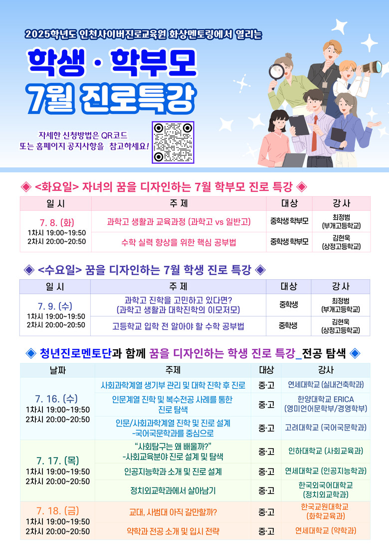 또한 인천 지역 고등학교 출신 청년진로멘토 8명이 참여해 전공 탐색, 복수전공 사례, 졸업 후 진로, 입시 전략 등 대학 생활에서의 실제 경험을 바탕으로 진로 설계와 학습 방법을 공유한다.