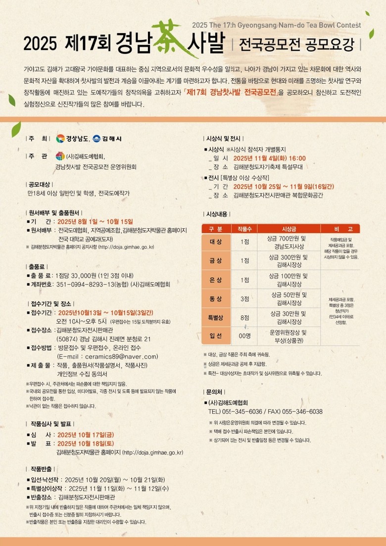 이번 공모전은 8월 1일부터 김해분청도자박물관 홈페이지 등에서 원서배부를 진행하고 있으며, 10월 13일부터 15일까지 3일간, 방문 또는 우편, 온라인 작품 신청을 받는다.