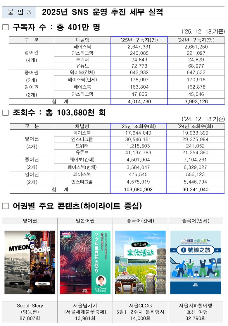 2025년 서울시는 외국어 SNS 채널에서 ▲어권.채널별 맞춤 콘텐츠 제작 ▲숏폼 기반 콘텐츠 확대 ▲참여형 이벤트 진행 ▲나노 인플루언서 협업을 추진해 누적 조회수 1억 뷰를 돌파했다. (전년 대비 22% 증가)