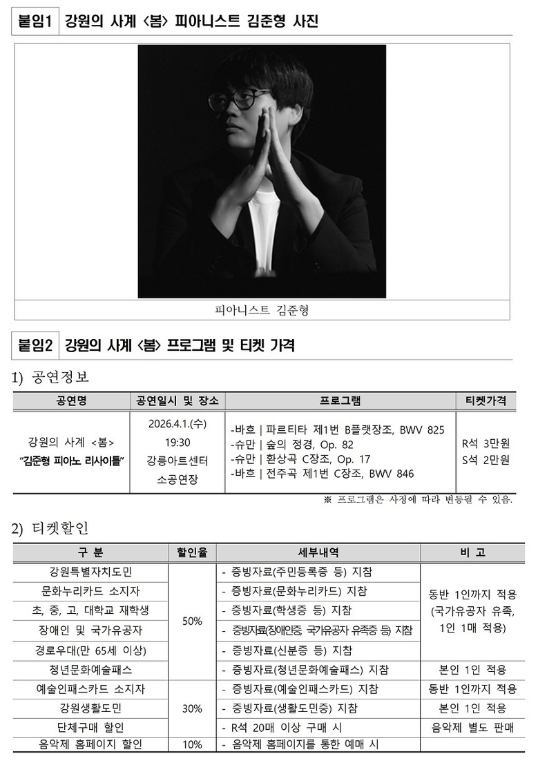 - 강원 관객 처음 만나는 김준형, 4월 1일(수) 오후 7시 30분 강릉아트센터 소공연장에서 바흐와 슈만 작품 선보여 [강원도 세계타임즈=김민석 기자] 강원문화재단(대표이사 신현상)은 2026 대관령음악제 기획공연 “강원의 사계 <봄>”에 피아니스트 김준형을 초청, 4월 1일(수) 오후 7시 30분 강릉아트센터 소공연장에서 독주회를 개최한다.