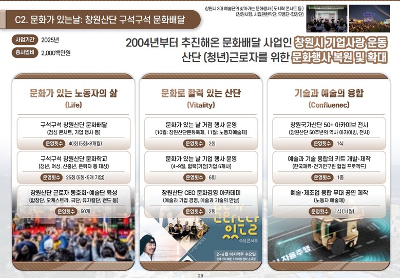 △ 창원산단 구석구석 문화배달 : 점심 콘서트, 공연, 전시 등 다양한 문화 프로그램을 산업단지 전역에 제공해 근로자와 지역 주민의 문화 향유 기회를 넓힌다.