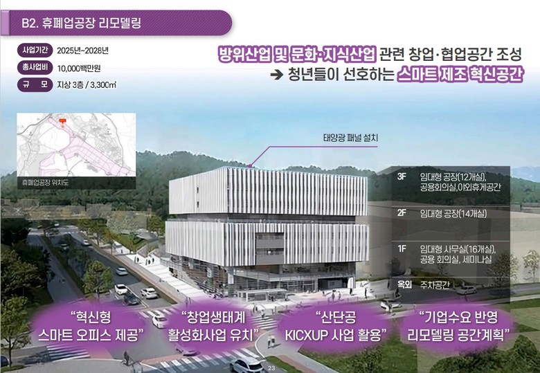 △ 휴폐업공장 리모델링 사업&청년문화센터 : 1989년 준공된 제2아파트형 공장의 ‘공장동’을 리모델링해 청년들이 선호하는 ICT, 지식산업 분야 창업공간 및 스마트 오피스로 재탄생시키고, ‘복지동’은 청년문화센터로 재구성해 문화·편의시설을 확충한다.