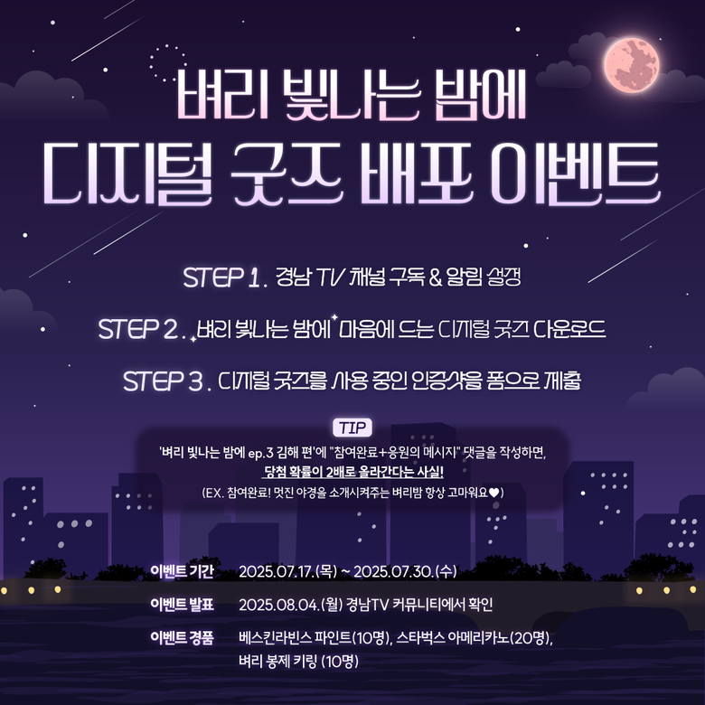 한편, 경남도는 지난 5월부터 야경 명소와 음악을 결합한 콘텐츠 ‘벼리 빛나는 밤에’를 유튜브 채널을 통해 공개하고 있다. 이 콘텐츠와 연계해, 밀양.창원.김해의 야경 명소를 배경으로 한 디지털 굿즈도 7월 17일부터 함께 배포 중이며, 배경화면을 인증하면 경품을 받을 수 있는 참여형 이벤트도 진행된다.