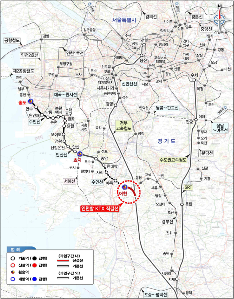 인천발 KTX 직결사업은 수인선에서 경부고속선을 연결하는 3.19km의 철길을 신설하고 기존 송도역(인천)과 초지역(안산), 어천역(화성)을 개량하는 공사로서, 사업 발주처인 국가철도공단은 ‛25년말까지 노반 주요 공사를 마무리하고, 내년 상반기 내 궤도 및 시스템 공사를 완료하여 2026년 하반기 종합 시운전이 가능할 것으로, 내년 말 개통을 목표로 공사를 추진 중이라고 밝혔다.