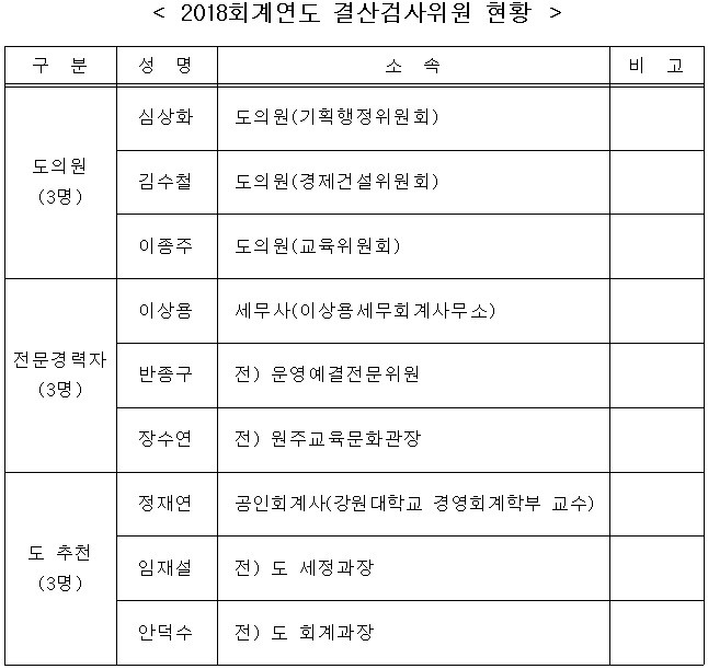 [강원도=세계타임즈 김민석 기자] 강원도의회(의장 한금석)는 4월 22일 도의회 상담실에서 9명의 결산검사위원을 위촉한다. 위원은 총 9명으로 도의원 3명, 전문경력자 3명, 도추천 3명으로 구성된다. * 위원 명단(붙임참조)
