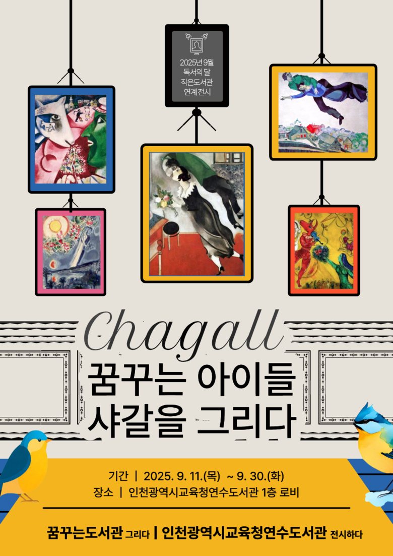 세계적 화가 샤갈의 삶과 작품을 소개하고 샤갈 명화를 응용한 드로잉 수업을 통해 완성된 초등학생 12명의 창작 작품을 선보이며, 전시는 도서관 개관 시간 동안 누구나 자유롭게 관람할 수 있으며, 매주 수요일은 휴관한다.