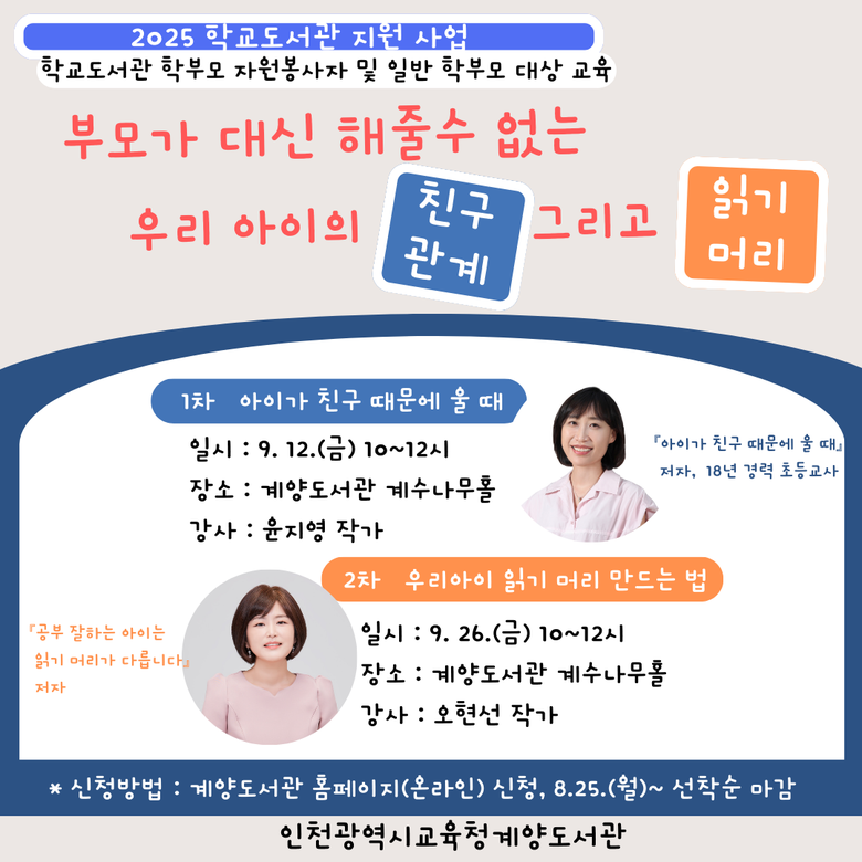 학교도서관 지원 사업의 일환으로 진행되는 이번 교육은 ‘부모가 대신 해줄 수 없는 우리 아이의 친구 관계, 그리고 읽기 머리’를 주제로 9월 12일과 26일 두 차례 진행된다.