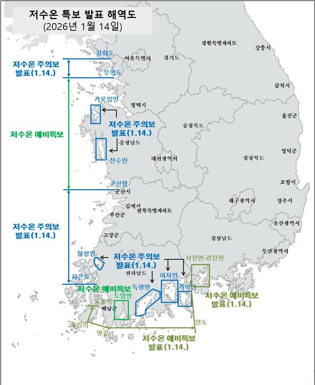 저수온 예비특보는 어업인이 사전 대응을 위해 수온 7℃를 기준으로 발표되며, 수온이 낮아질수록 저수온 주의보와 경보로 격상해 특보가 발표된다.