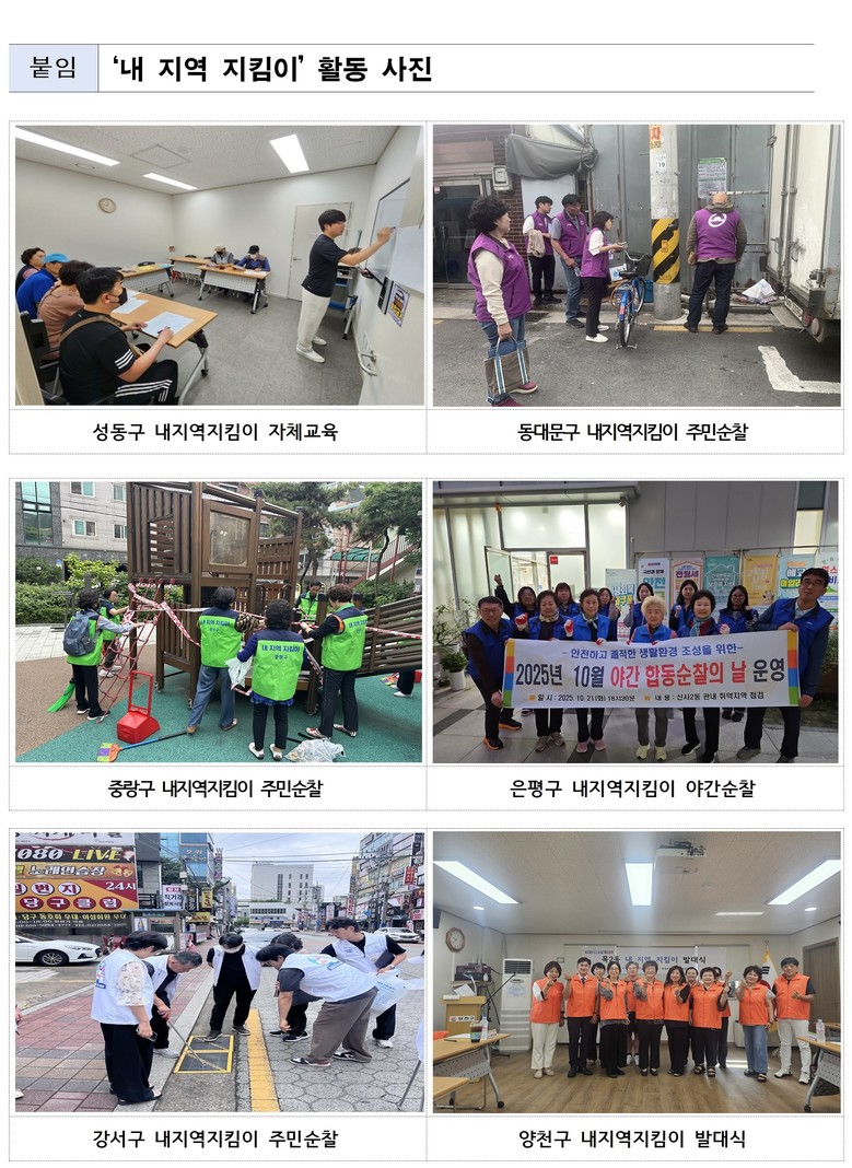 ‘내 지역 지킴이’는 우리 동네의 불편 지역과 취약요소를 가장 잘 알고 있는 주민들로 구성된 생활불편사항 신고요원으로, 현재 25개구 427개 동에서 총 5,771명이 활동 중이다. 올 한해 지킴이들이 신고한 생활불편 신고 건수는 15만 3,169건으로 1인당 평균 26건을 신고하였다.(’25.10.31 기준)