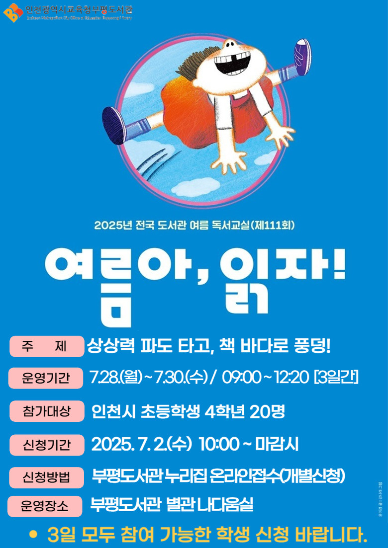 자세한 사항은 부평도서관 어린이자료실(☎510-7361)로 문의하거나, 누리집(lib.ice.go.kr/bupyeong)을 참고하면 된다.