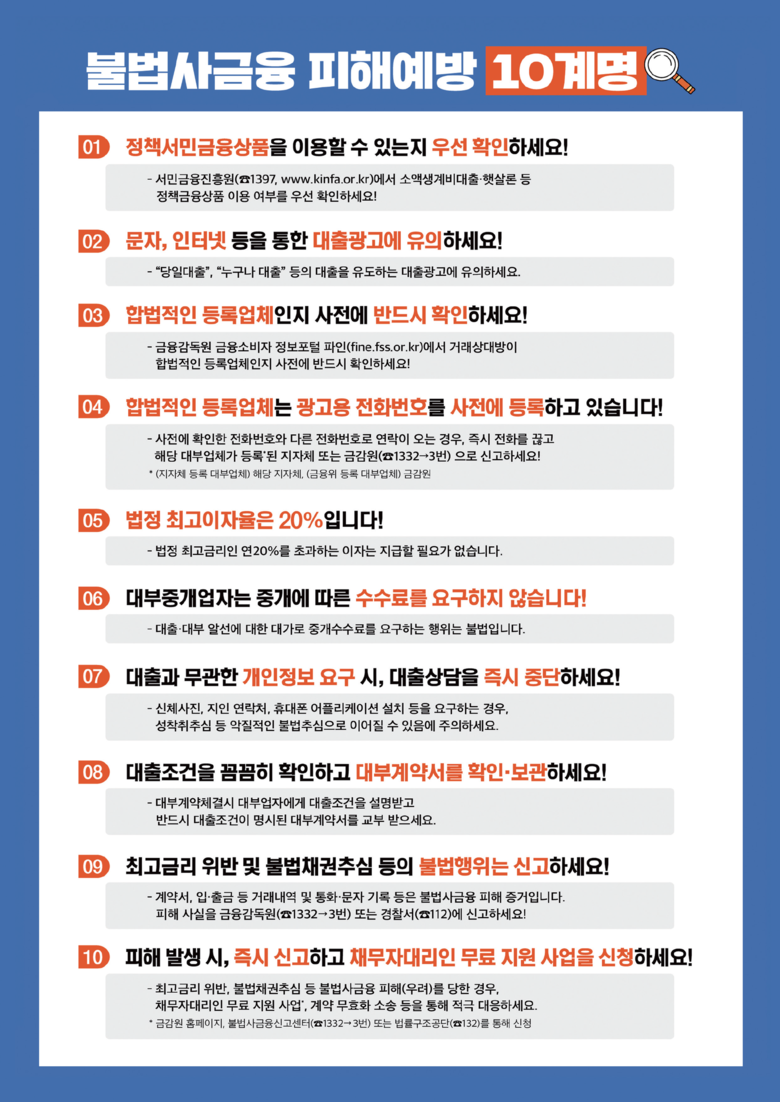 한편 서울시는 불법 대부 행위에 대한 자영업자들의 각별한 유의와 함께 의심 사례는 적극적으로 신고 또는 제보해 줄 것을 당부했다.