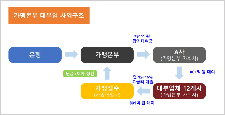 - 은행에서 저금리로 운영‧시설자금 차입 후 가맹점주에 연 12~15% 고금리 대출