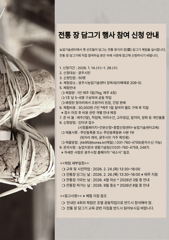 모집인원은 광주시민 50명이며, 신청 기간은 1월 14일부터 28일까지 15일간이다. 교육은 2월 24일과 26일 이틀간 사전교육 및 장 담그기를 시작으로, 오는 9월까지 총 4회에 걸쳐 진행될 예정이다.