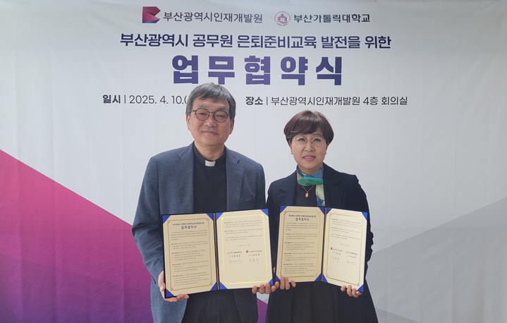이번 협약은 공무원들의 은퇴 후 삶에 대한 체계적인 준비를 지원하기 위해 마련됐으며, 김은희 시 인재개발원장, 홍경완 부산가톨릭대학교 총장 등이 참석했다.