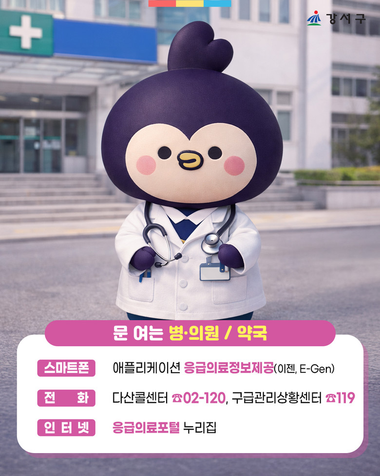 특히, 야간과 휴일에도 소아 진료를 책임지는 달빛어린이병원으로 지난해 지정된 ‘강서푸른꿈어린이성모병원(공항대로41길 34)’과 새벽 1시까지 운영하는 심야약국 ‘365열린약국(공항대로41길 52)’이 포함된다.