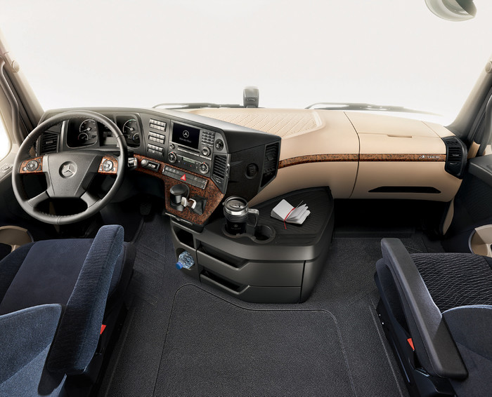 한편, 메르세데스-벤츠 악트로스 명성에 걸맞은 TFT-LCD 창을 통해 라이트, 오디오, 보조 냉난방 시스템 등 다양한 편의 기능을 원격 조절할 수 있는 다기능 컨트롤 키(Multi Function Key), 무시동 히터/에어컨(Aux-Heater/Aircon), 열선/통풍 시트(Heating/Cooling Seat) 등 프리미엄 편의 사양을 기본 장착하여 거실에 있는 것과 같은 안락하고 편안한 주행 환경을 제공한다.